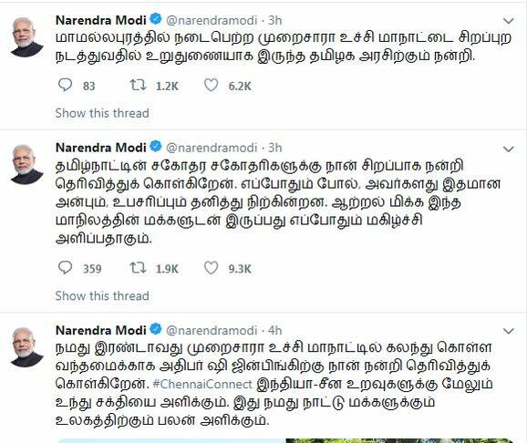 இதற்கிடையே, பிரதமர் மோடி தனது ட்விட்டர் பக்கத்தில் சீன அதிபர் ஜின்பிங்குக்கு சீனமொழியிலேயே நன்றி தெரிவித்தார். அதைப் போல் ஆங்கில மொழியிலும், தமிழ் மொழியிலும் இந்த மாநாடு சிறப்பாக நடைபெற உதவியவர்களுக்கு நன்றி தெரிவித்துள்ளார். தமிழக மக்கள், மாநில அரசு மற்றும் கட்சிகள், அமைப்புகளுக்கும் நன்றி தெரிவித்துள்ளார்.