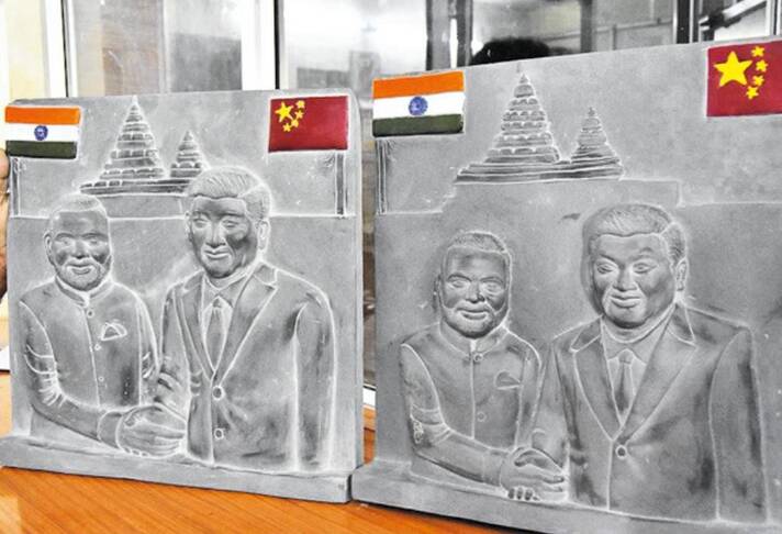 பிரதமர் மோடியும், சீன அதிபர் ஜின்பிங்கும் சிரித்துக் கொண்டு கைகுலுக்குவது போல் அமைக்கப்பட்ட இந்த கற்சிற்பம் 25 கிலோ எடையில் உருவாக்கப்பட்டுள்ளது. இந்த சிற்பங்களில் ஒன்று மாமல்லபுரம் மக்கள் சார்பில் இரு நாட்டு பாதுகாப்பு அதிகாரிகள் மூலம் நேற்று சீனாவுக்கு அனுப்பி வைக்கப்பட்டது. மற்றொன்று மாமல்லபுரத்தில் வைக்கப்படும் எனத் தெரிகிறது.