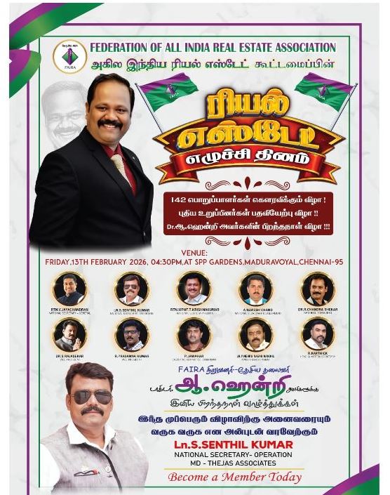 அகில இந்திய ரியல் எஸ்டேட் அமைப்பின் நிறுவனர் ஏ. ஹென்றி பிறந்த நாள் விழா, ரியல் எஸ்டேட் எழுச்சி தினம் மற்றும் புதிய நிர்வாகிகள் பதவியேற்பு விழா ஆகிய முப்பெரும் விழா சென்னை மதுரவயலில் உள்ள எஸ்.பி.பி கார்டனில் நாளை (பிப்- 12) பிரமாண்டமாக நடைபெறுகிறது. இந்த நிகழ்ச்சியில் 142 புதிய பொறுப்பாளர்கள் கவுரவிக்கப்படுகின்றனர். விழாவில் புதிய உறுப்பினர்களும் பதவியேற்றுக் கொள்கின்றனர்.
