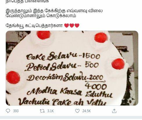 தேங்ஸ் கண்ணுங்களா என்று கேக்கை பார்த்ததும் அதிர்ச்சி அடைந்தார். கேக் மேல் விலைப் பட்டியல் இருந்ததுதான் அதற்குக் காரணம். கேக் செலவு-1500, பெட்ரோல் செலவு - 500 , டெக்ரேஷன் செலவு - 2000 மொத்தம் -4000. மொதல்ல காசு குடுத்துட்டு அப்பறம் கேக் வெட்டு என்று அதில் குறிப்பிட்டுள்ளனர். அதற்குச் சூரி,400 ரூவா கேக்கை கொடுத் துட்டு 4000 ருவாய புடிங்கிருச்சுங்க நாபெத்த பிள்ளைங்க. இருந்தாலும் இந்த கேக்கிற்கு எவ்வளவு விலை வேண்டுமானாலும் கொடுக்கலாம். தேங்க்யூ கட்டிபெத்தார்களா என்று கிண்டலாகக் குறிப்பிட்டுள்ளார்.