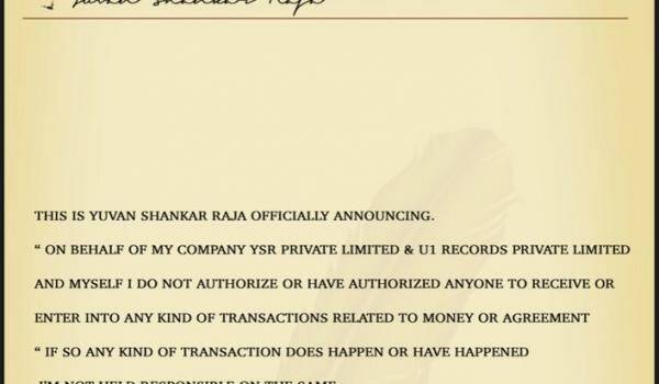 யுவன் சங்கர் ராஜா தனது ஒய்.எஸ்.ஆர் பிரைவேட் லிமிடெட் மற்றும் யு 1 ரெக்கார்ட்ஸ் பிரைவேட் லிமிடெட் சார்பாக எந்த வொரு பரிவர்த்தனையையும் கையாள ஒரே அங்கீகாரம் பெற்ற நபர் நான் மட்டும் தான் என்பதை வெளிப்படுத்தும் ஒரு இடுகையைப் பகிர்ந்துள்ளார். அந்த அறிவிப்பில் கூறும் போது, “எனது நிறுவனம் ஒய்.எஸ்.ஆர் பிரைவேட் லிமிடெட் & யு 1 ரெக்கார்ட்ஸ் பிரைவேட் லிமிடெட் சார்பாக, என் தொடர்பான எந்தவொரு பரிவர்த்தனையும் பெறவோ அல்லது தலையிடவோ யாரையும் நான் அங்கீகரிக்கவில்லை. பணம் அல்லது ஒப்பந்தம் எதற்கும் இது பொருந்தும். எந்தவொரு பரிவர்த்தனையும் நான் இல்லாமல் நடந்தால் அல்லது நடந்திருந்தால் நான் அதற்கு பொறுப்பேற்க மாட்டேன். எனது நிறுவனமான ஒய்.எஸ்.ஆர் பிரைவேட் லிமிடெட் & யு 1 ரெக்கார்ட்ஸ் பிரைவேட் லிமிடெட் நிறுவனத்தை பிரதிநிதித்துவப் படுத்த என்னைத் தவிர வேறு எந்த நபருக்கும் அதிகாரம் இல்லை எனக் குறிப்பிட்டிருக்கிறார்.