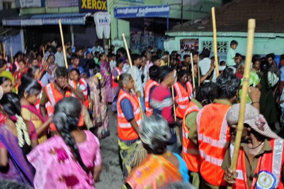 கோவை மாவட்டத்தில் புகழ் பெற்ற காரமடை தேர் திருவிழா நேற்று நடந்தது. ஆயிரக்கணக்கானோர் தேருக்கு முன்னரும் பின்னரும் சென்று கொண்டிருந்தனர். அப்போது, தேருக்கு பின்னாலே குப்பைகளை அகற்றிக் கொண்டு இருபதுக்கும் மேற்பட்ட நகராட்சி தூய்மை பணியாளர்கள் வந்தனர்.