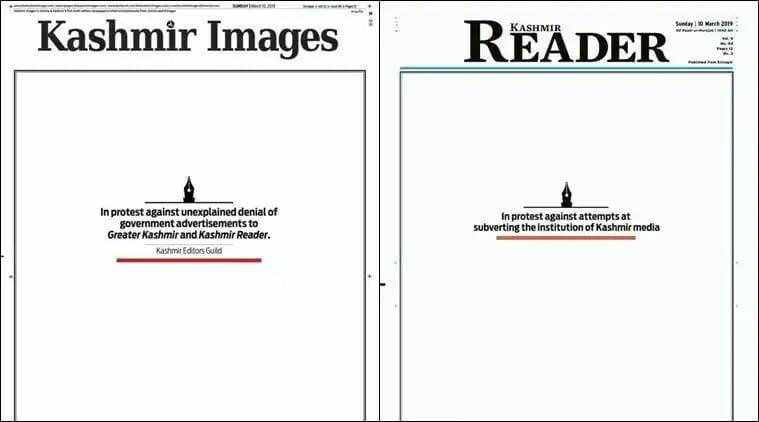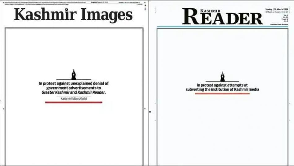 காஷ்மீர் மாநில அரசுக்கு எதிர்ப்பை காட்டும் வகையில் இன்று காஷ்மீரில் வெளியான நாளிதழ்கள் அனைத்தும் முதல் பக்கத்தில் செய்திகள் ஏதுமின்றி வெற்றிடமாக்கி பிரசுரித்தன.