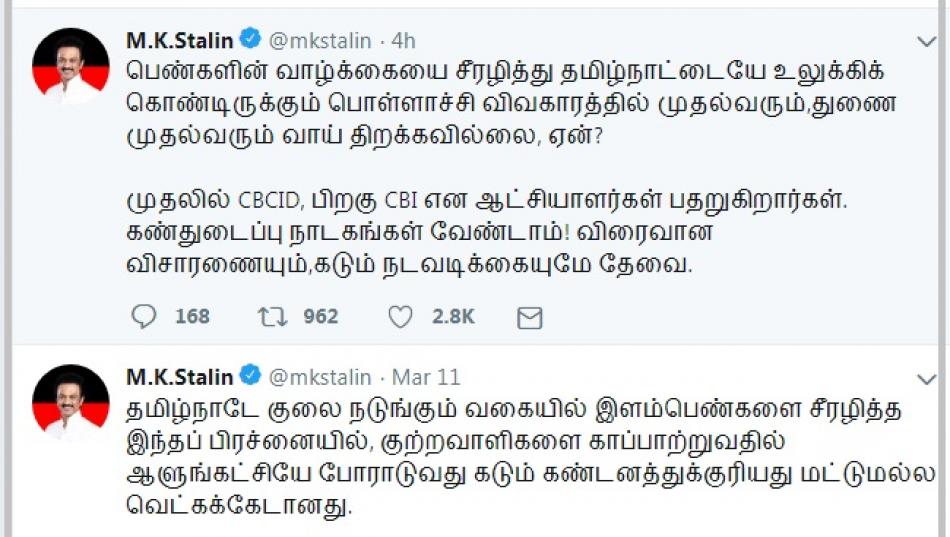 தமிழ்நாட்டையே உலுக்கிக் கொண்டிருக்கும் பொள்ளாச்சி விவகாரத்தில், முதல்வரும், துணை முதல்வரும் வாய் திறக்காமல் இருப்பது ஏன் என்று, திமுக தலைவர் மு.க.ஸ்டாலின் கேள்வி எழுப்பியுள்ளார்.