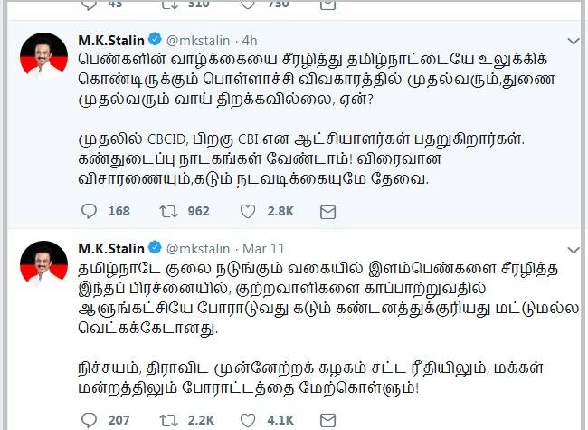 பொள்ளாச்சி கொடூர சம்பவத்தில், முதலில் சிபிசிஐடி, பிறகு சிபிஐ என்று, ஆட்சியாளர்கள் பதறுகிறார்கள். கண்துடைப்பு நாடகங்கள் வேண்டாம். விரைவான விசாரணையும் கடும் நடவடிக்கையும் தேவை.