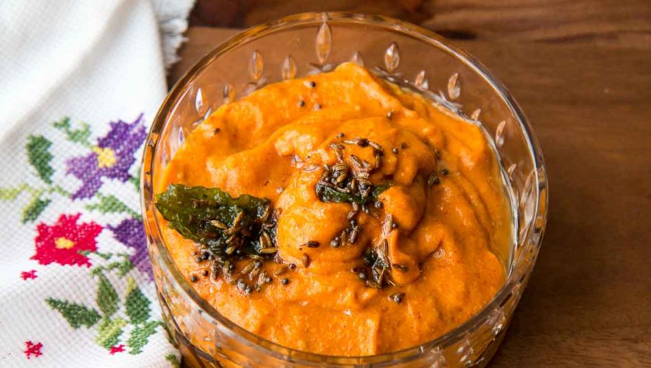 வாணலியில், எண்ணெய்விட்டு சூடானதும், கடுகு, உளுத்தம் பருப்பு, காய்ந்த மிளகாய், கறிவேப்பிலை சேர்த்து வதக்கியதும் அரைத்து வைத்த சட்னியை சேர்த்து கிளறி இறக்கவும்.