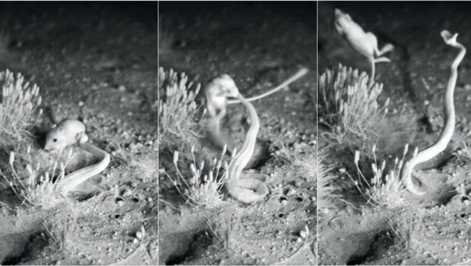 பசியில் வாடிய விஷப்பாம்பு எளிதான இரையாக எலியை எண்ணி அருகில் சென்றது. அதனை கவ்வி பிடிக்க முயன்ற போது, குங்பூ வீரனைப் போல் தாவிய எலி, பாம்பின் தலையில் உதைவிட்டு எகிறிச் சென்றது. கண் இமைக்கும் நேரத்தில் நிகழ்ந்த இந்த தாக்குதலால் நிலைகுலைந்த பாம்பு, பின்னர் தடுமாற்றத்துடன் நகர்ந்து சென்றது. வலைத்தளத்தில் வெளியான இந்த காட்சி தற்போது வைரலாகி வருகிறது.