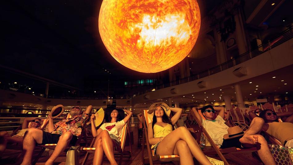 இந்த ஆரஞ்சு நிற ஓளிப் பந்தை உருவாக்க 12 வாரங்கள் கடின உழைப்பை கொட்டியுள்ளனர். சுமார் 12,000 லைட் பல்புகளின் ஒளி வீசும் தன்மையை இந்த குட்டி சூரியன் வெளிப்படுத்தி வருகிறது.
