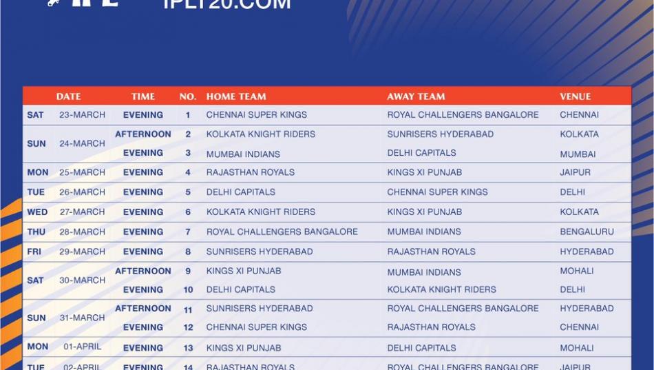 இந்நிலையில் முதல் இரண்டு வாரங்களுக்கான போட்டி அட்டவணை தற்போது வெளியாகியுள்ளது. இதன்படி மார்ச் 23-ந் தேதி சென்னையில் நடைபெறும் முதல் போட்டியில் சென்னை சூப்பர் கிங்ஸ் அணியும் பெங்களூரு ராயல் சேலஞ்சர்ஸ் அணியும் பலப்பரீட்சை நடத்துகின்றன. தற்போதைய முதல் கட்ட அட்டவணைப்படி மார்ச் 23 முதல் ஏப்ரல் 5-ந் தேதி வரையிலான 2 வார காலப் போட்டிகளுக்கான விபரம் வெளியாகியுள்ளது. பொதுத் தேர்தல் தேதி அறிவிப்பைப் பொறுத்து மற்ற போட்டிகள் விபரம் வெளியாகும் என்று தெரிகிறது.