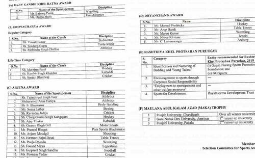 இதேபோல், தமிழகத்தைச் சேர்ந்த பாடி பில்டிங் வீரர் எஸ். பாஸ்கரன், மகளிர் கிரிக்கெட் வீராங்கனை பூனம் யாதவ், தடகளத்தில் தஜிந்தர் பால் சிங், முகமது அனாஸ், ஸ்வப்னா பர்மான், கால்பந்து வீரர் குர்ப்ரீத் சிங் சந்து, ஹாக்கி வீரர் சிங்லசனா சிங், துப்பாக்கிச்சுடுதல் வீராங்கனை அஞ்சும் முட்கில், கபடி வீரர் அஜய் தாகூர் உள்ளிட்ட 19 வீரர்களுக்கு அர்ஜுனா விருது வழங்கப்படுகிறது.