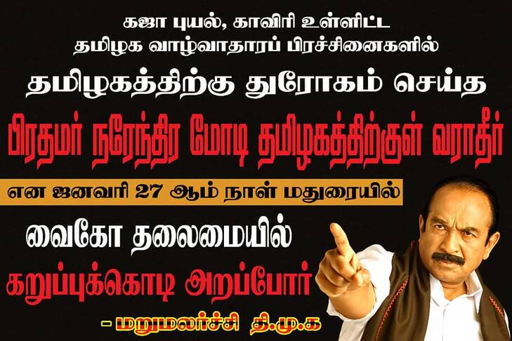 ஆகையால் அவரது மதுரை வருகைக்கு எதிர்ப்பு தெரிவித்து கறுப்புக் கொடி போராட்டம் நடத்தப்படும். இதில் அனைவரும் பங்கேற்க வேண்டும் என அழைப்பு விடுத்துள்ளார். இப்போராட்டத்துக்கு வைகோ தலைமை வகிப்பார் எனவும் அறிவிக்கப்பட்டுள்ளது.