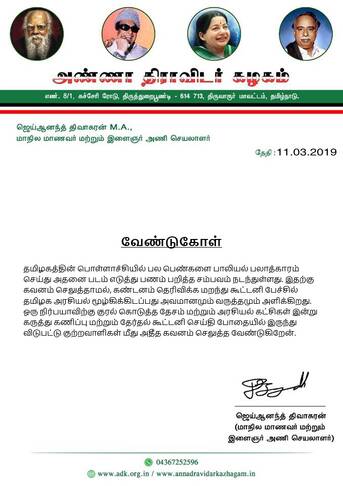 பொள்ளாச்சி பாலியல் விவகாரத்தில் கவனம் செலுத்தாமல், கூட்டணி போதையில் தமிழக அரசியல் கட்சிகள் ஈடுபட்டுள்ளதாக, அண்ணா திராவிடர் கழகத்தின் மாநில மாணவர் மற்றும் இளைஞரணி செயலாளர் ஜெய் ஆனந்த் திவாகரன் கண்டனம் தெரிவித்துள்ளார்.