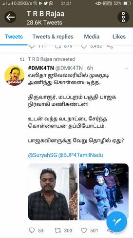 இந்நிலையில், மணிகண்டனை பாஜகவைச் சேர்ந்தவர் என்று ஒருவர் ட்வீட் போட அதை திமுக மூத்த தலைவர் டி.ஆர்.பாலுவின் மகனும், எம்எல்ஏவுமான டி.ஆர்.பி.ராஜா ரீட்விட் செய்தார். அதில், பாஜகவினருக்கு வேறு தொழில் ஏது என்றும் கமென்ட் போட்டார். இதையடுத்து, பாஜக செய்திதொடர்பாளர் நாராயணன் திருப்பதி இது பற்றி டிஜிபிக்கு புகார் அனுப்பியுள்ளார். அதில் அவர், மணிகண்டன் பாஜகவைச் சேர்ந்தவர் என்று ஒருவர் போட்ட ட்விட்டை திமுக எம்எல்ஏ. ராஜா, ரீட்விட் செய்துள்ளார். கொள்ளை வழக்கில் கைதான மணிகண்டன் பாஜகவைச் சேர்ந்தவரே அல்ல. டிடிவி திவாகரனுடைய கட்சியைச் சேர்ந்தவர் மணிகண்டன் என்று சமூக ஊடகங்களில் செய்தி வந்துள்ளது.