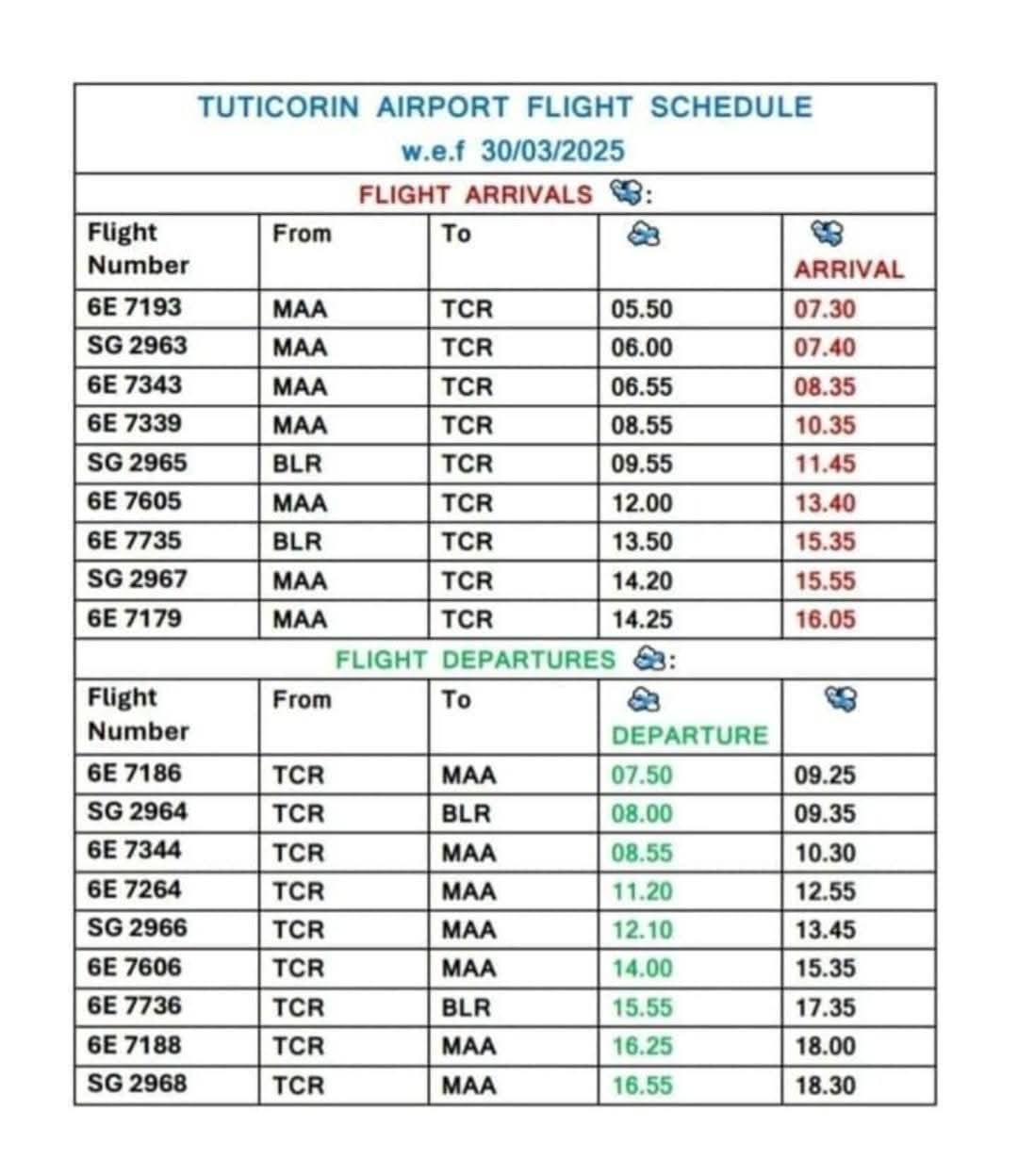 பண்டிகை காலங்கள், முகூர்த்த நாட்கள், கோடை விடுமுறை காலங்கள் போன்றவைகளில் விமானங்களில் டிக்கெட்டுகள் கிடைப்பதில்லை. . இதை தொடர்ந்து, சென்னையில் இருந்து தூத்துக்குடிக்கு அதிக விமானங்களை இயக்க முடிவு செய்யப்பட்டுள்ளது.
