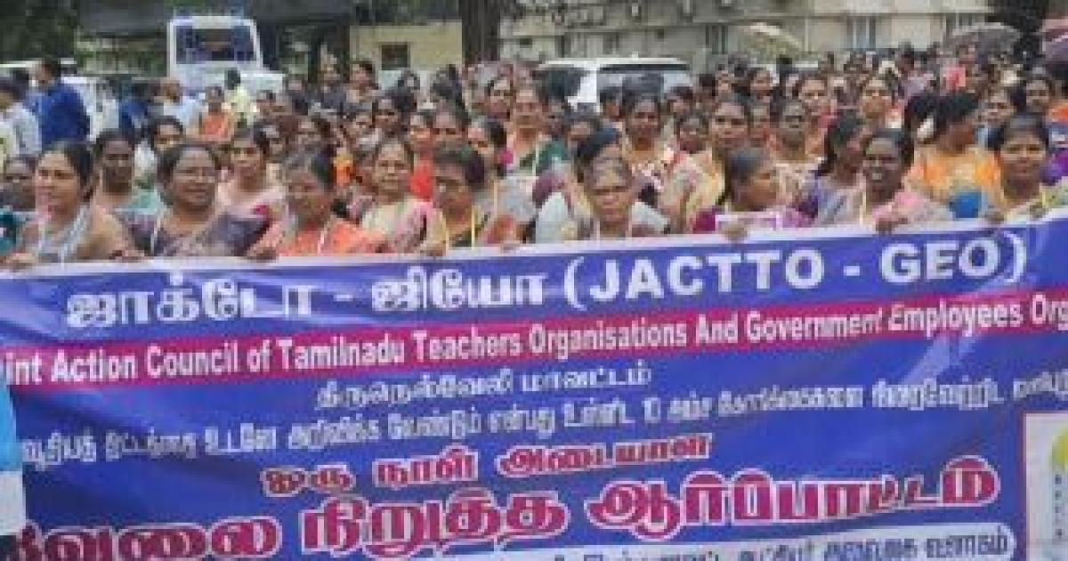 புதிய பென்ஷன் திட்டத்தை ரத்து செய்துவிட்டு, பழைய பென்ஷன் திட்டத்தைமீண்டும் கொண்டு வர வேண்டும், அத்துடன் காலிப் பணியிடங்களை நிரப்ப வேண்டும் என்பது உள்ளிட்ட 10 அம்சக் கோரிக்கைகளை வலியுறுத்தி, திருநெல்வேலி மாவட்டத்தில் இன்று (நவ. 18) *ஜாக்டோ-ஜியோ* அமைப்பைச் சேர்ந்த அரசு ஊழியர்கள் மற்றும் ஆசிரியர்கள் ஒரு நாள் அடையாள வேலைநிறுத்தப் போராட்டத்தில் ஈடுபட்டனர்.