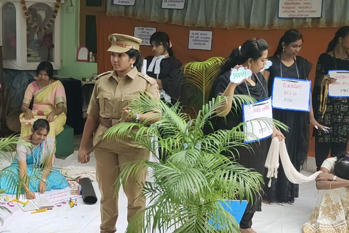 ஒரு பெண் ஆசிரியராகப் பணிபுரிந்தாலும், வீட்டில் சமையல், குழந்தைப் பராமரிப்பு, முதியோர் பராமரிப்பு எனப் பல பொறுப்புகளைத் தாங்குவதையும், அதே சமயம் சட்ட ரீதியான உரிமைகளைத் தெரிந்து வைத்திருப்பதன் அவசியத்தையும் மாணவிகள் தத்ரூபமாகச் சித்தரித்துக் காட்டினர்.